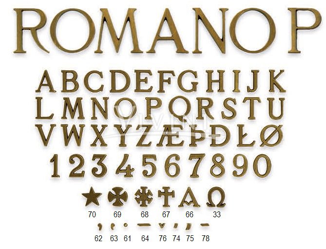 Litery nagrobne wykonane z brązu, zabezpieczone warstwą lakieru, która nie pozwala na interakcję materiału z otoczeniem. Są one całkowicie odporne na zmiany atmosferyczne dzięki czemu z powodzeniem mogą być stosowane zarówno w pomieszczeniach jak i na zewnątrz.